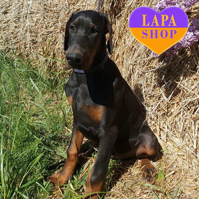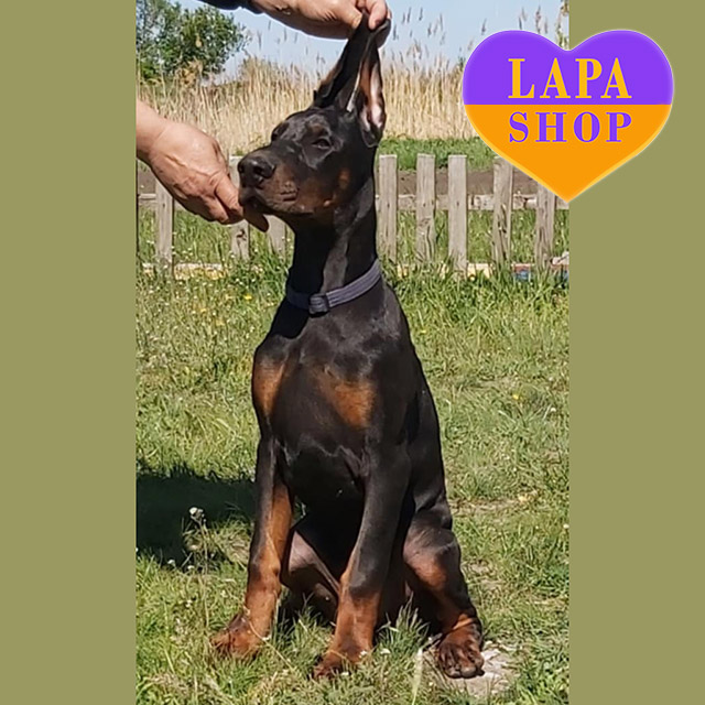 Цей витончений доберман із глибоким чорним підпалим забарвленням вражає своєю елегантністю та силою. Його блискуча шерсть підкреслює гармонійність статури, а виразні очі додають йому шарму. Завдяки своєму розкішному зовнішньому вигляду він точно привертатиме увагу.