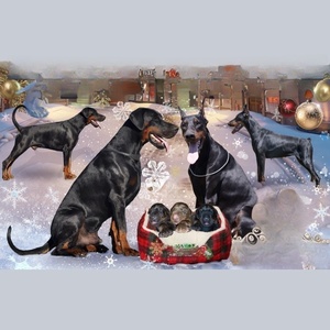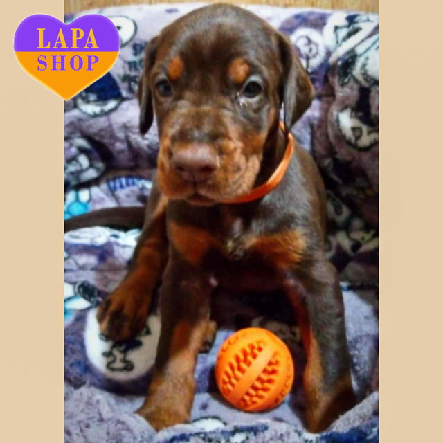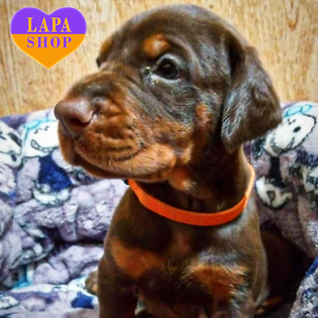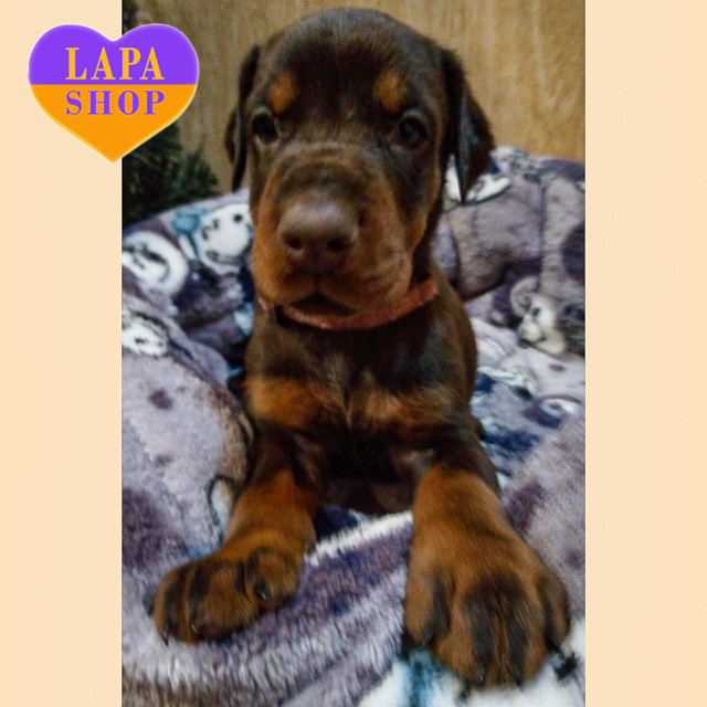 Граційна доберманка з насиченим коричневим підпалим забарвленням. Її шовковиста шерсть чудово підкреслює витончені лінії тіла, а очі випромінюють шляхетність і мудрість. Ця красуня гармонійно поєднує в собі силу та витонченість, створюючи враження справжньої аристократки.