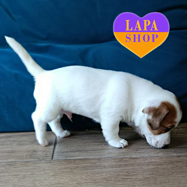 Чарівний хлопчик породи джек-рассел-тер’єр у біколорному забарвленні з виразною плямкою на голові. Його тулуб білосніжний, а компактні короткі лапки додають йому особливого шарму. Малюк гладкошерстий, акуратний і вже привчається до пелюшки.
