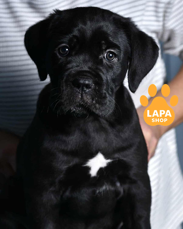 Чорна дівчинка породи кане корсо з гармонійною статурою та сильним поставом, який підкреслює елегантність і силу породи. Її глибокий чорний окрас робить зовнішність особливо виразною та ефектною.