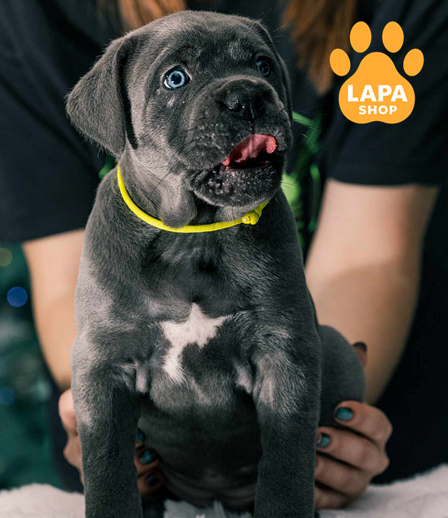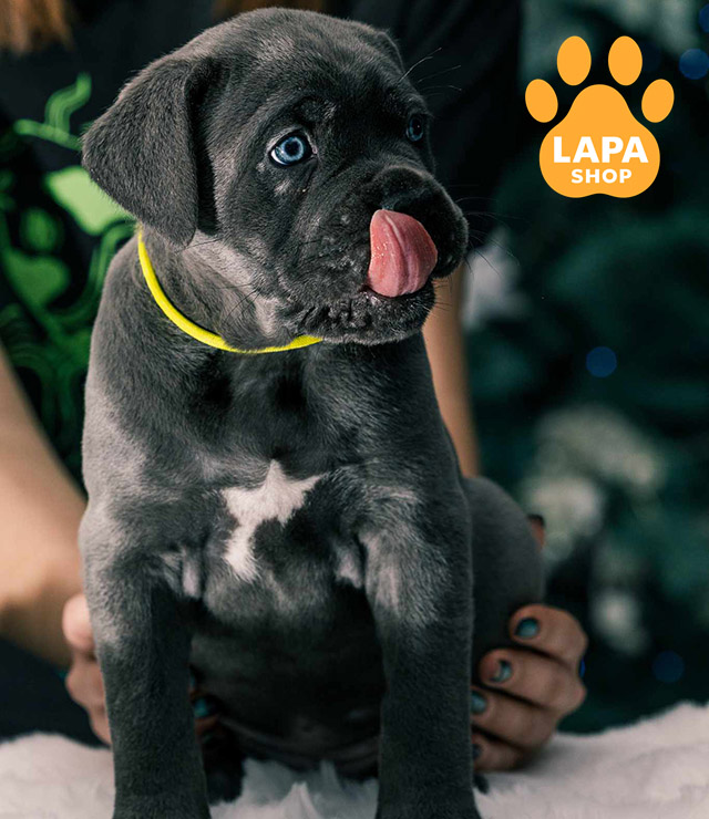 Сіра дівчинка породи кане корсо з міцною і пропорційною статурою, що підкреслює силу та благородність породи. Її окрас робить зовнішність особливо привабливою, а погляд і поставка додають впевненості та харизми.
