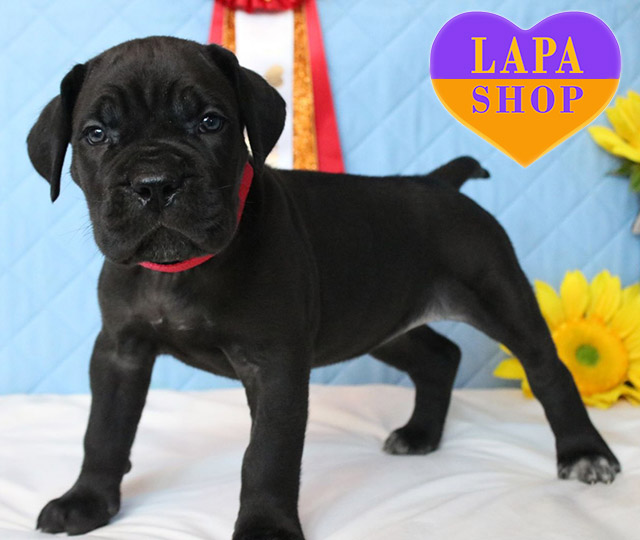 Ця елегантна дівчинка породи кане корсо з глибоким чорним забарвленням, яке підкреслює її граційність і силу. Вона має благородну зовнішність, міцну будову та врівноважений темперамент, що робить її ідеальною як для розведення, так і для активного сімейного життя. Її погляд уже вражає глибиною та інтелігентністю.