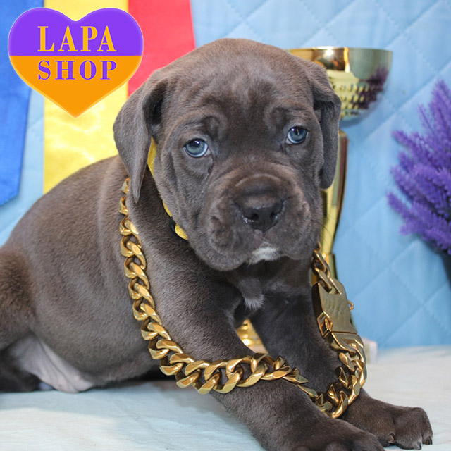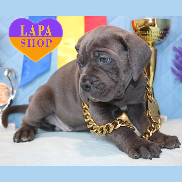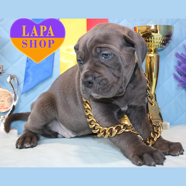 Чарівна дівчинка породи кане корсо з ефектним сірим забарвленням. Її сильна та гармонійна статура підкреслює елегантність і впевненість. Виразний погляд і шляхетний вигляд роблять її справжньою окрасою породи.