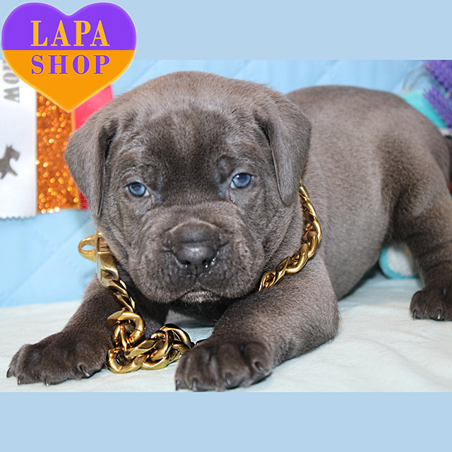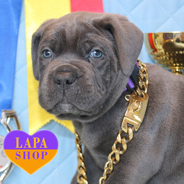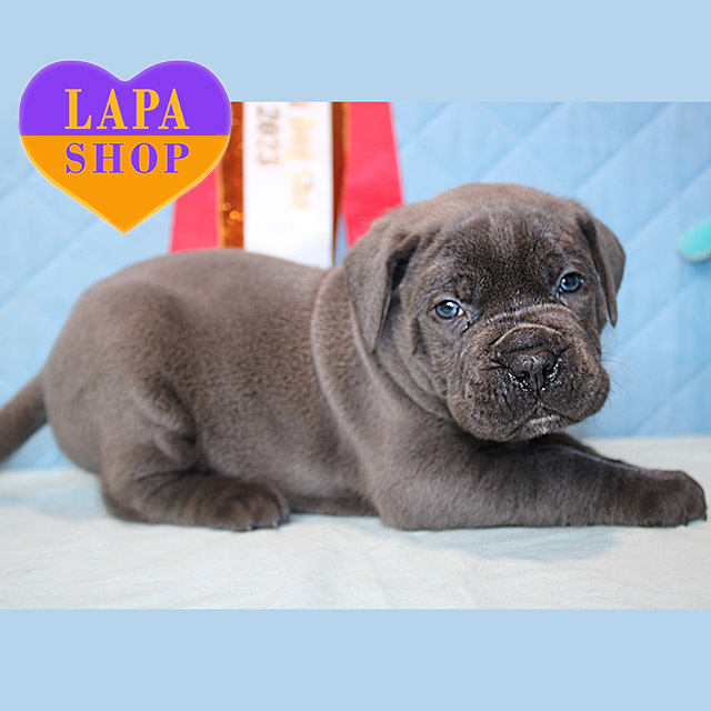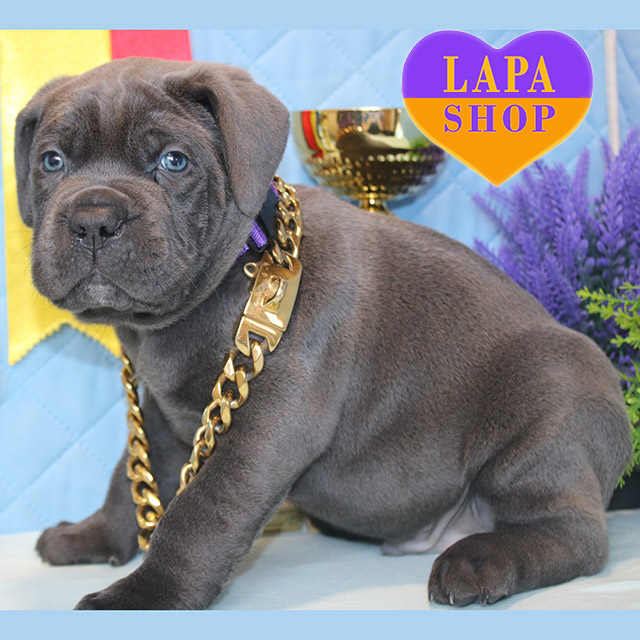 Милий хлопчик породи кане корсо з ефектним сірим забарвленням. Його сильна та гармонійна статура підкреслює елегантність і впевненість. Виразний погляд і шляхетний вигляд роблять його справжньою окрасою породи.