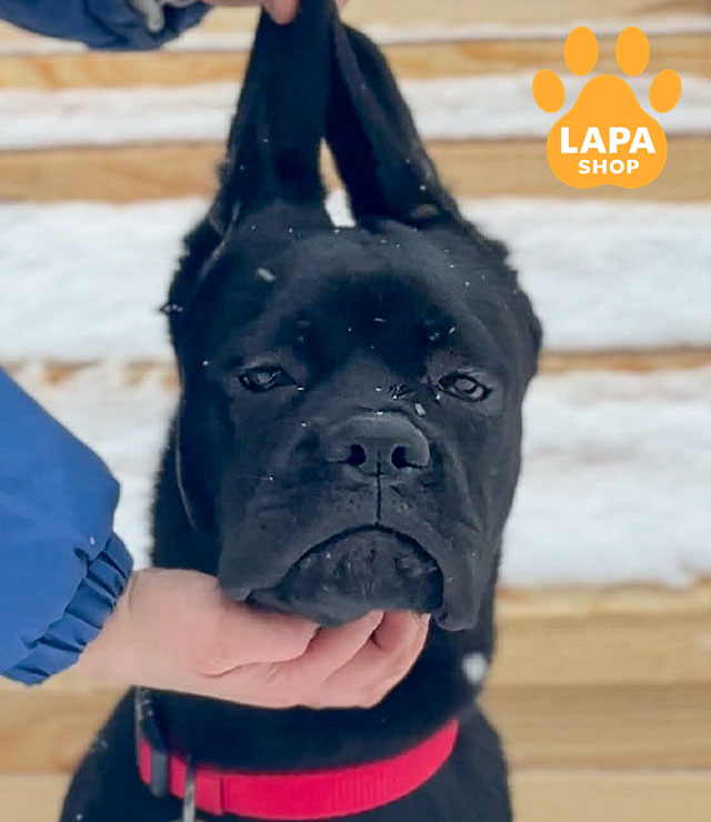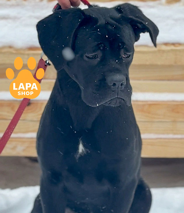 Uganda — ефектна дівчинка породи кане корсо з глибоким чорним забарвленням, яке підкреслює її міцну статуру та виразний силует. Гармонійні пропорції, благородний вигляд і породний тип роблять її зовнішність особливо привабливою.