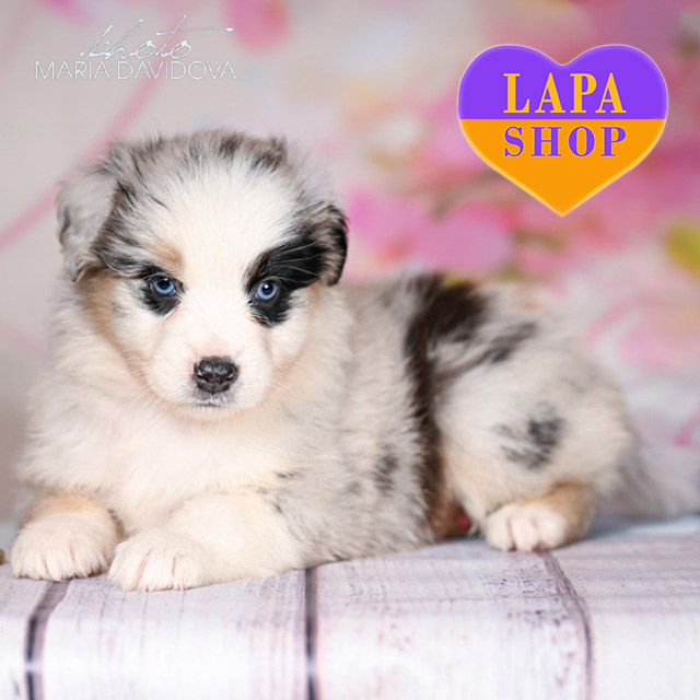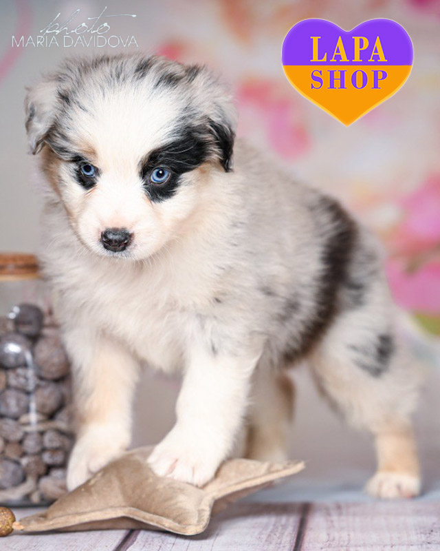 Ця мініатюрна американська вівчарка — блакитний мармур з ефектними блакитними очима, що надають їй особливої чарівності. Вона походить від титулованих батьків, обидва з яких є чемпіонами численних країн і мають чисті генетичні тести, що робить її перспективною для розведення. Її унікальне забарвлення та пропорційна будова роблять її справжньою родзинкою серед цуценят породи.