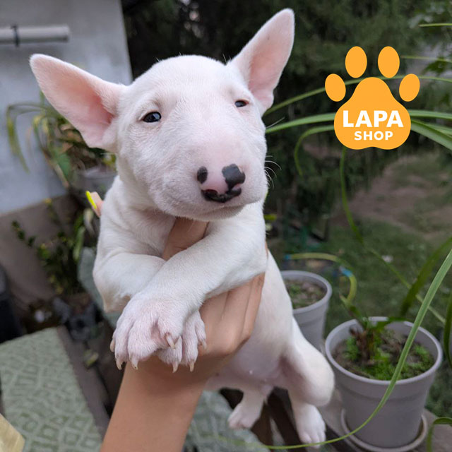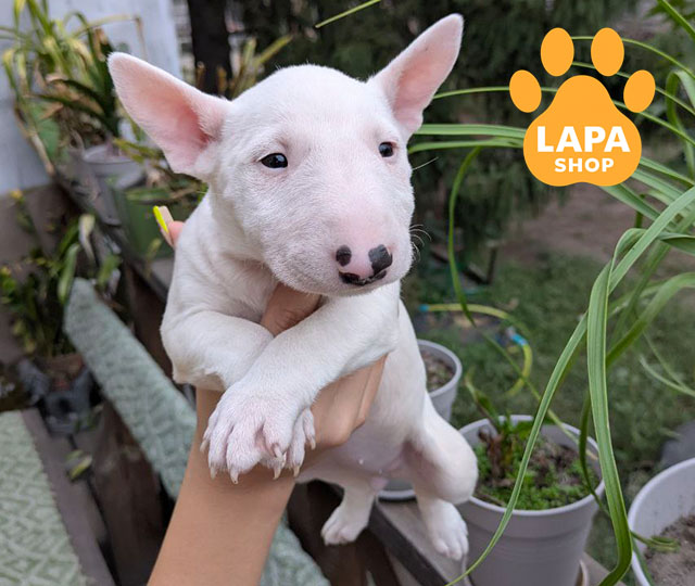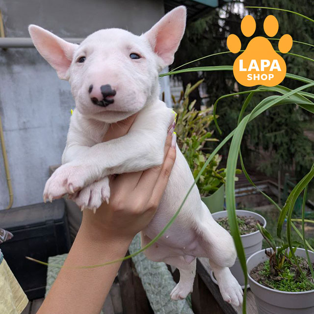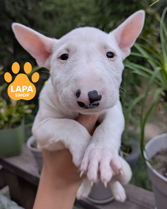 Ця мініатюрна біла дівчинка бультер’єра вражає своєю миловидністю та гармонійними пропорціями. Її пухнаста шерсть і елегантна форма мордочки підкреслюють породну красу. Вона має лагідний та спокійний характер, що робить її чудовим компаньйоном для родини.