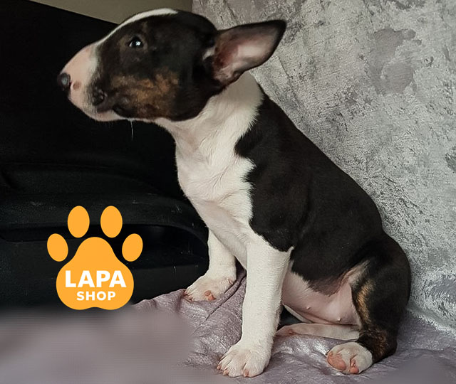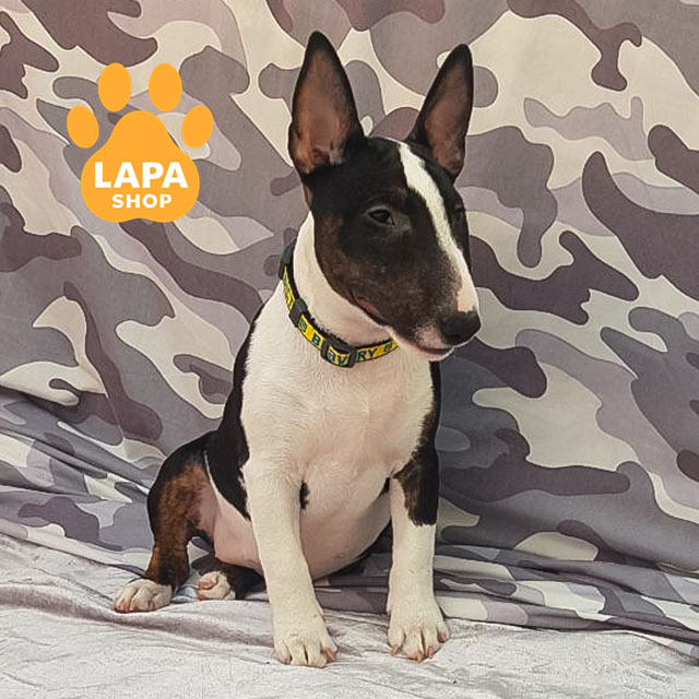 Маленька леді породи мініатюрний бультер’єр з рідкісним забарвленням black brindled white виглядає стильно та яскраво. Її гармонійна статура та виразна мордочка роблять її справжньою окрасою породи.