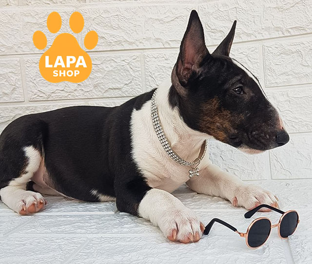 Маленька леді породи мініатюрний бультер’єр з рідкісним забарвленням black brindled white виглядає стильно та яскраво. Її гармонійна статура та виразна мордочка роблять її справжньою окрасою породи.