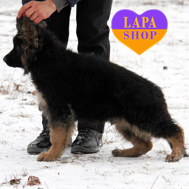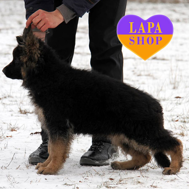 Цей елегантний хлопчик німецької вівчарки має класичне чепрачне забарвлення – насичене чорне хутро, яке гармонійно поєднується з рудими відтінками. Його міцна статура, потужні лапи та виразна морда надають йому шляхетного вигляду.