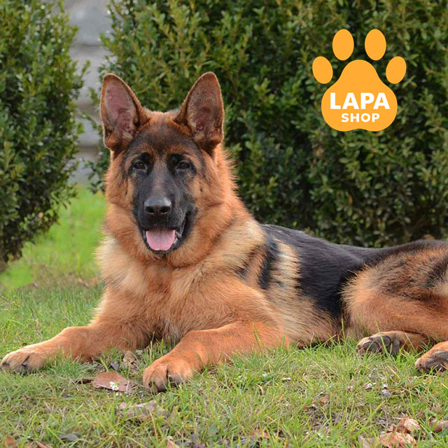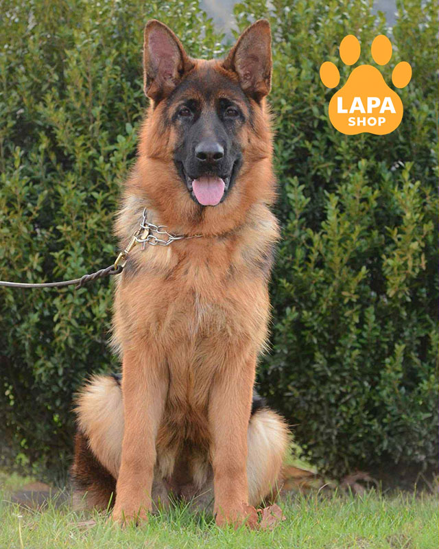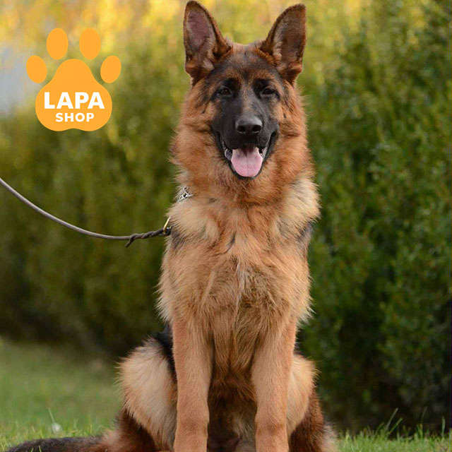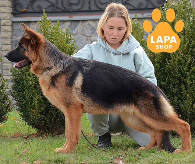 Чарівна німецька вівчарка чепрачного забарвлення з гармонійними пропорціями та благородною поставою. Її стандартна шерсть виглядає доглянуто та підкреслює витонченість силуету.