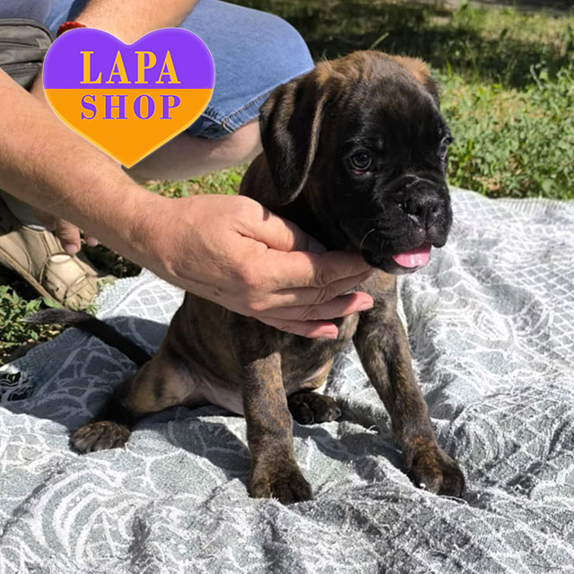 Милий німецький боксер у гарному тигровому забарвленні. Його гармонійна статура та яскравий окрас роблять його привабливим для родини. Малюк має красиву зовнішність і потенціал для дорослого собаки.