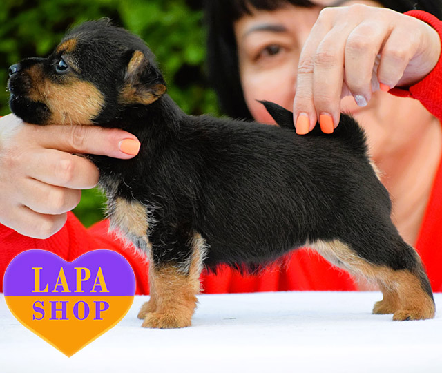 Ця яскрава представниця породи норвіч-тер’єрр із насиченим чорно-підпалим забарвленням. Її компактне тіло, жвавий погляд і виразні вушка надають їй особливого шарму. Ця кмітлива красуня має класичний породний вигляд і стане чудовим другом для тих, хто цінує енергійність та елегантність у малому форматі.