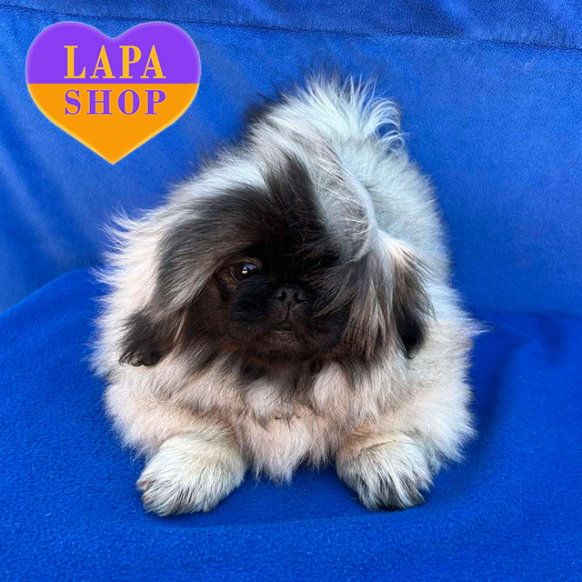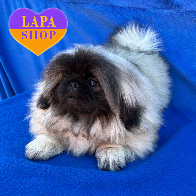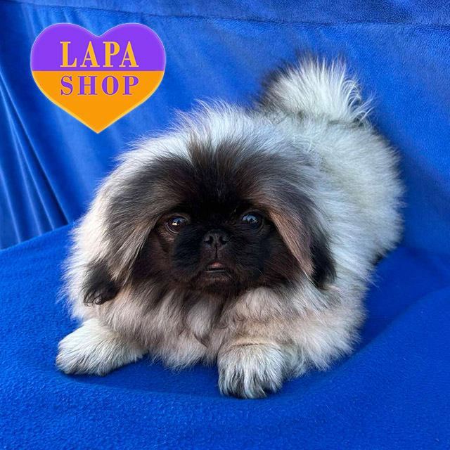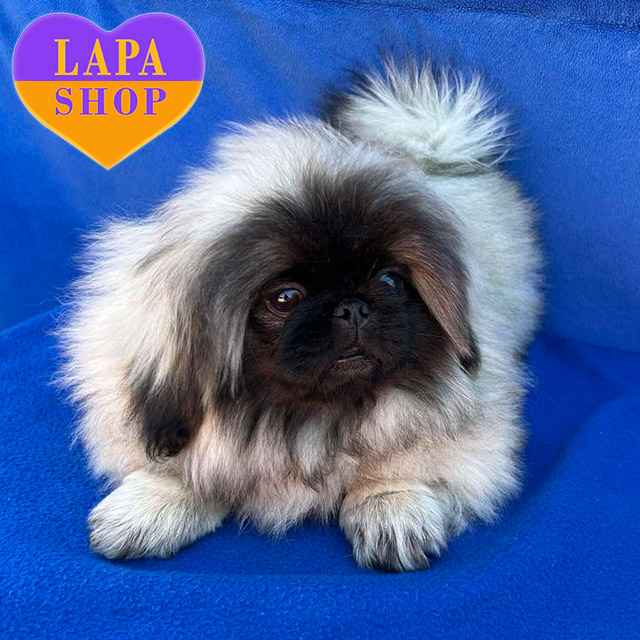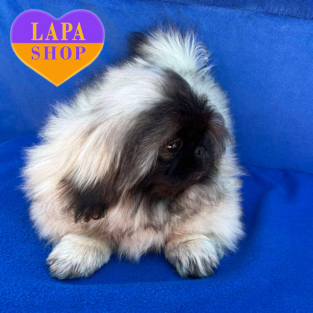 Чарівний красень породи пекінес з ніжним палевим забарвленням і виразною чорною маскою привертає увагу своєю вишуканою зовнішністю. Його компактне тіло і багата шерсть надають йому справжнього аристократичного вигляду.
