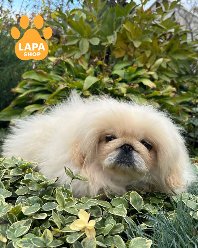 Милий хлопчик породи пекінес у ніжному кремовому забарвленні. Його пухнасте хутро та виразна мордочка надають йому особливого шарму.