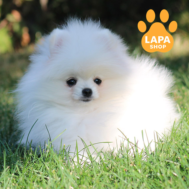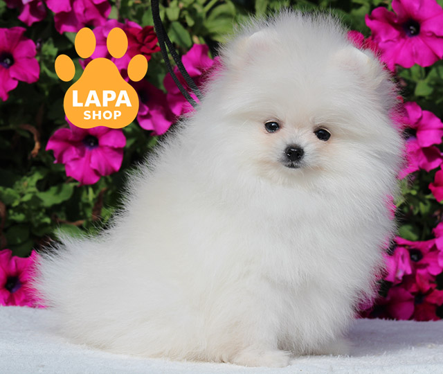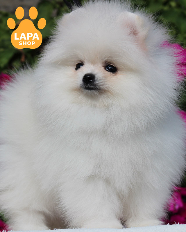 Мила дівчинка породи померанський шпіц білого забарвлення маленького розміру. Її пухнаста шерсть і витончені риси роблять її дуже привабливою та чарівною.