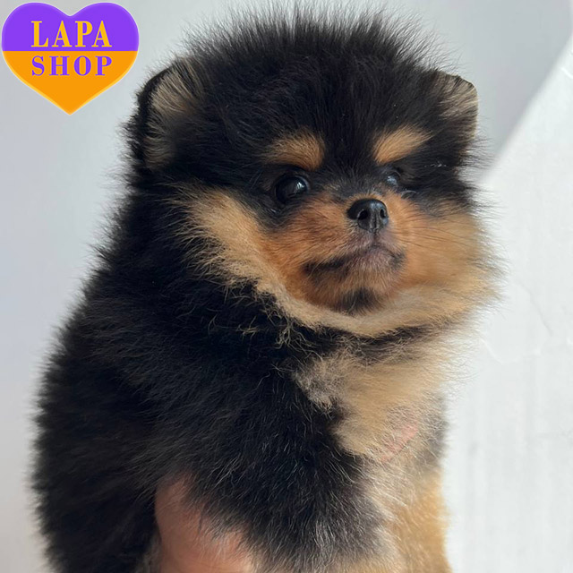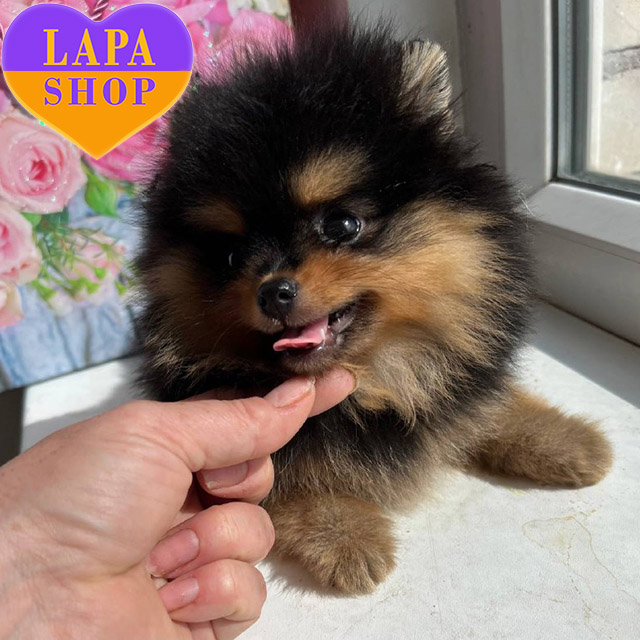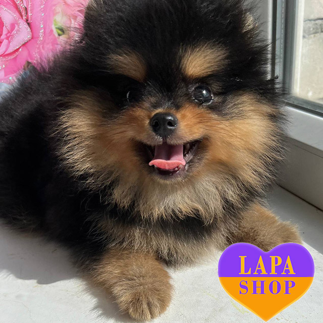 Ця чарівна дівчинка породи померанський шпіц з контрастним чорно-підпалим забарвленням виглядає неймовірно ефектно. Її компактне пухнасте тільце та яскравий вигляд неодмінно привернуть увагу.
