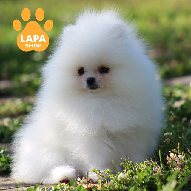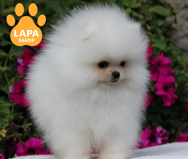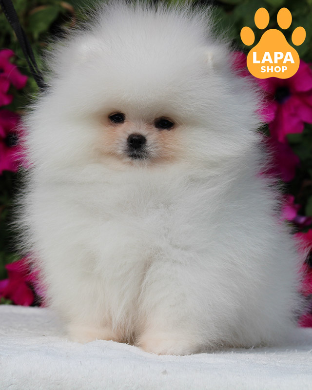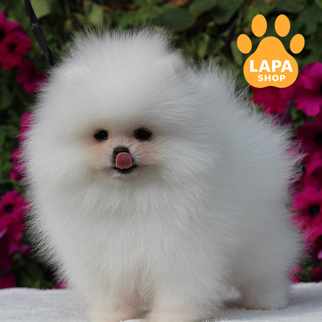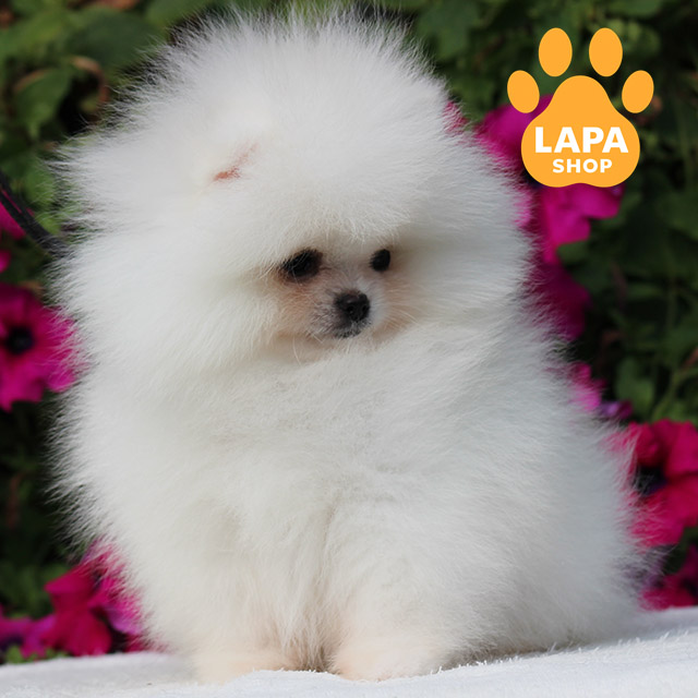 Маленький хлопчик породи померанський шпіц білого забарвлення з вагою приблизно 2–2,5 кг. Його пухнаста шерсть і акуратна статура роблять його дуже привабливим та милим.