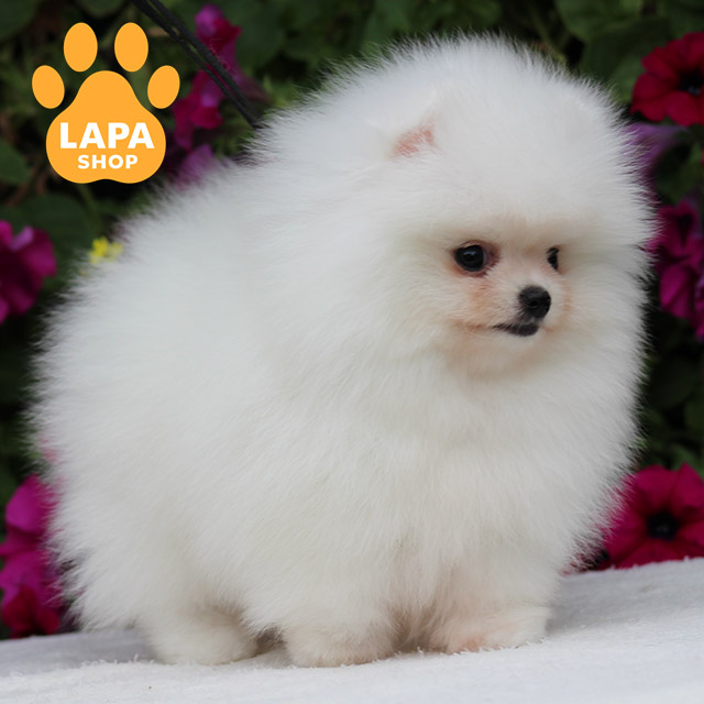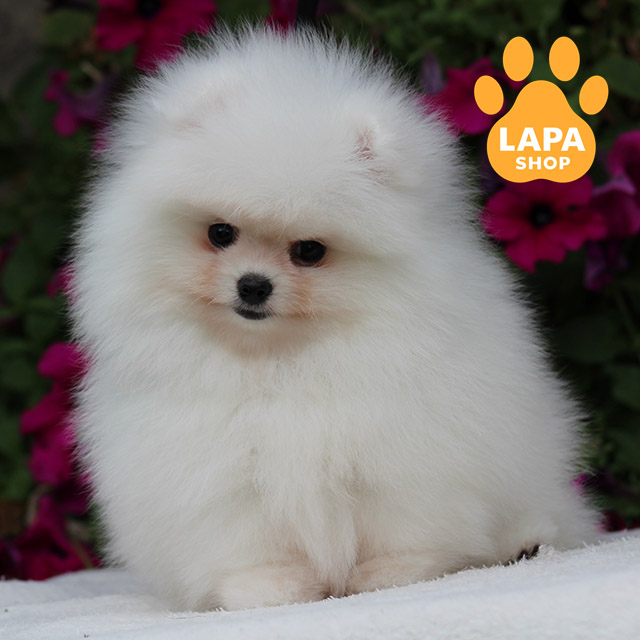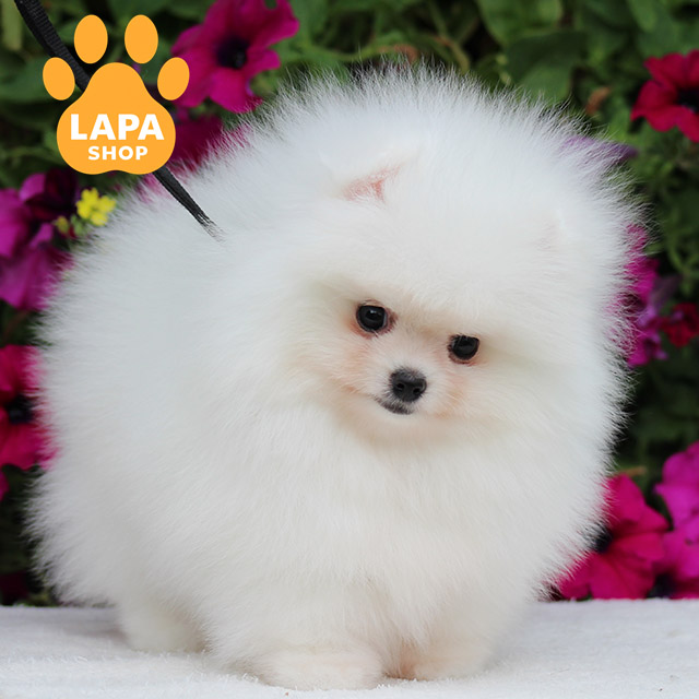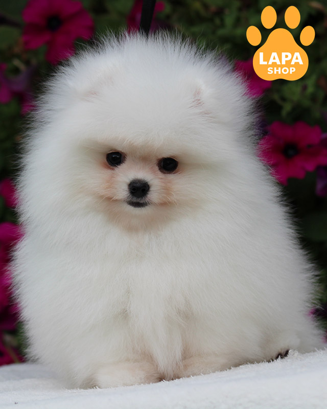 Мила дівчинка породи померанський шпіц білого забарвлення та маленького розміру, яка вражає своєю ніжною зовнішністю та пухнастою шерстю. Її чарівний вигляд робить її справжньою окрасою вашого дому.