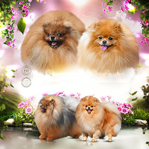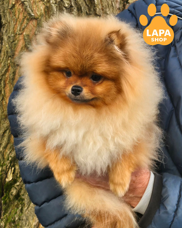 Дівчинка породи померанський шпіц з ніжним оранж-соболиним забарвленням та виразною породною зовнішністю. Пухнаста шубка з м’якими переходами відтінків підкреслює її охайний та привабливий вигляд.