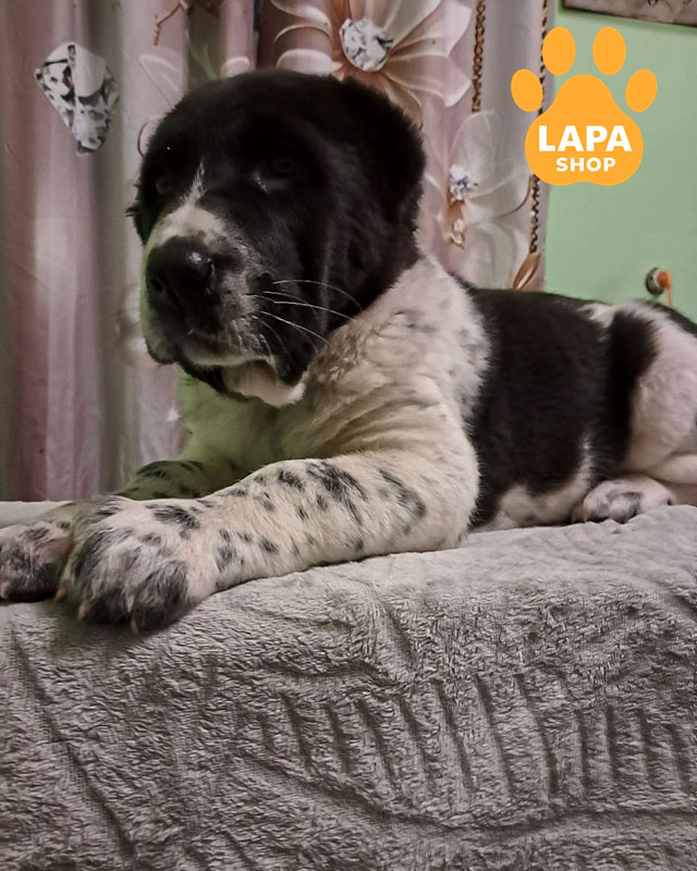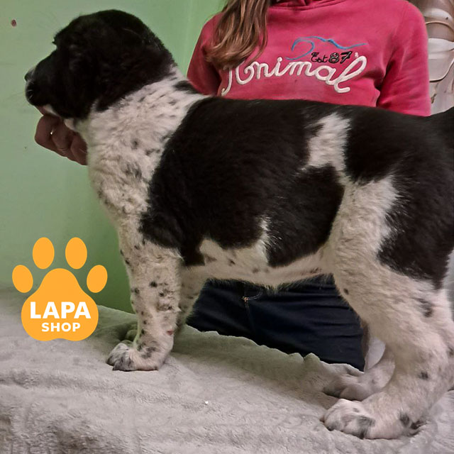 Дівчинка породи середньоазіатська вівчарка має ефектне чорно-біле забарвлення з «чорним плащем», що підкреслює її величну та гармонійну статуру. Потужна конституція й міцний кістяк роблять її справжнім представником породи. Вона виглядає впевнено і породньо, справляючи сильне враження з першого погляду.