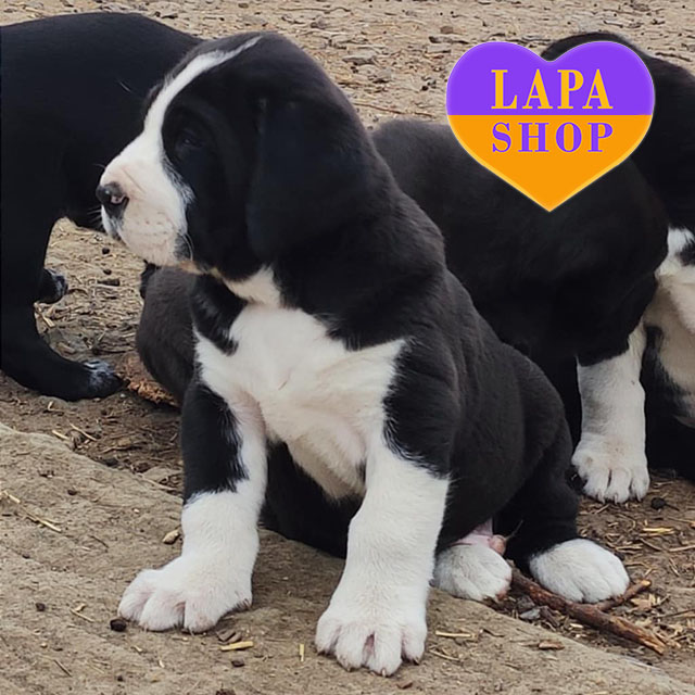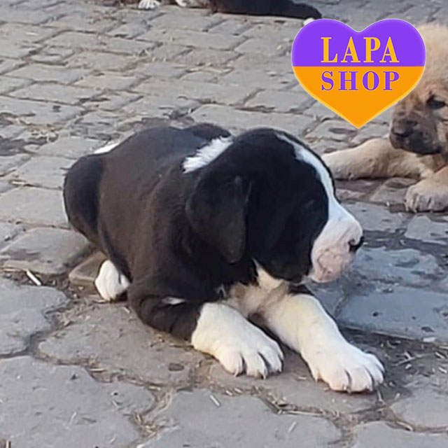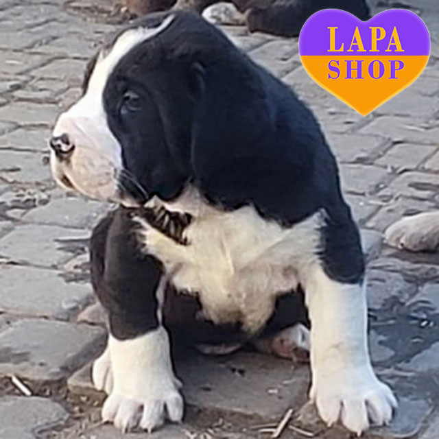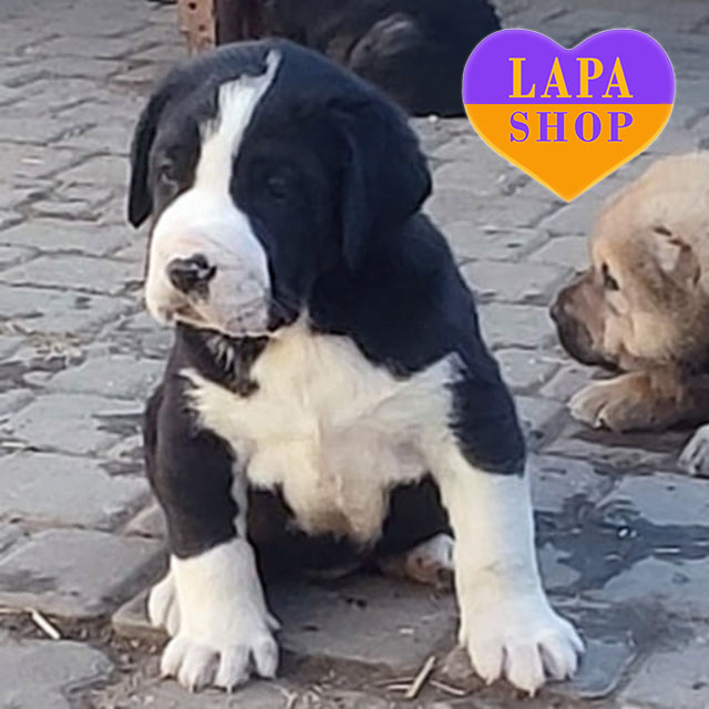 Цей величний хлопчик породи середньоазійська вівчарка вражає своїм чорно-білим забарвленням, що надає йому особливого вигляду. Він має потужну та міцну зовнішність, що ідеально відповідає його породи.