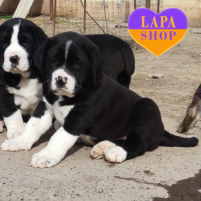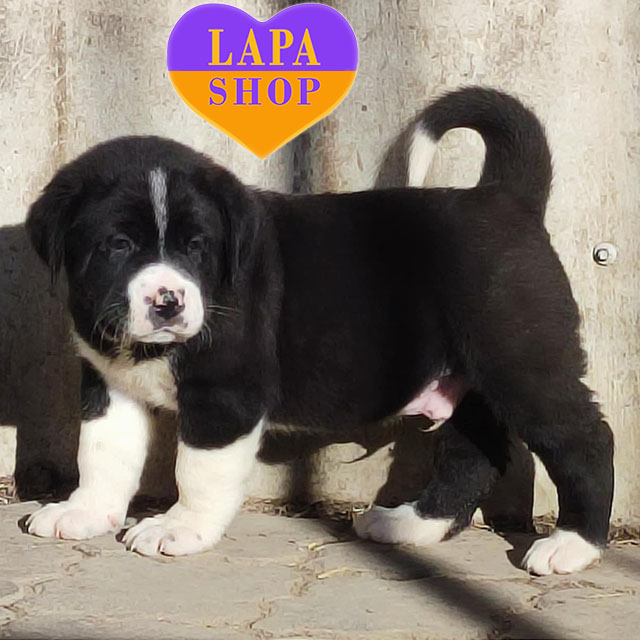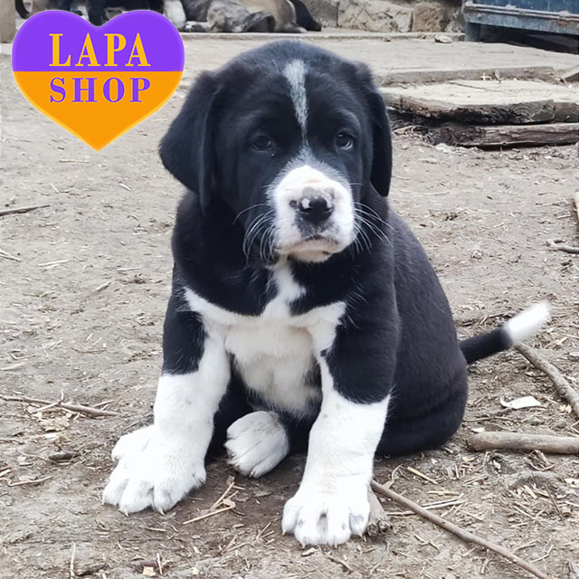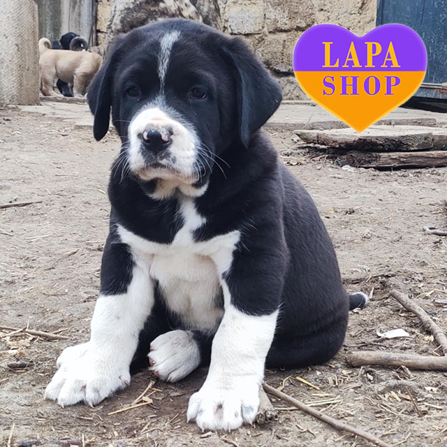 Цей величний хлопчик породи середньоазійська вівчарка вражає своїм чорно-білим забарвленням, що надає йому особливого вигляду. Він має потужну та міцну зовнішність, що ідеально відповідає його породи.