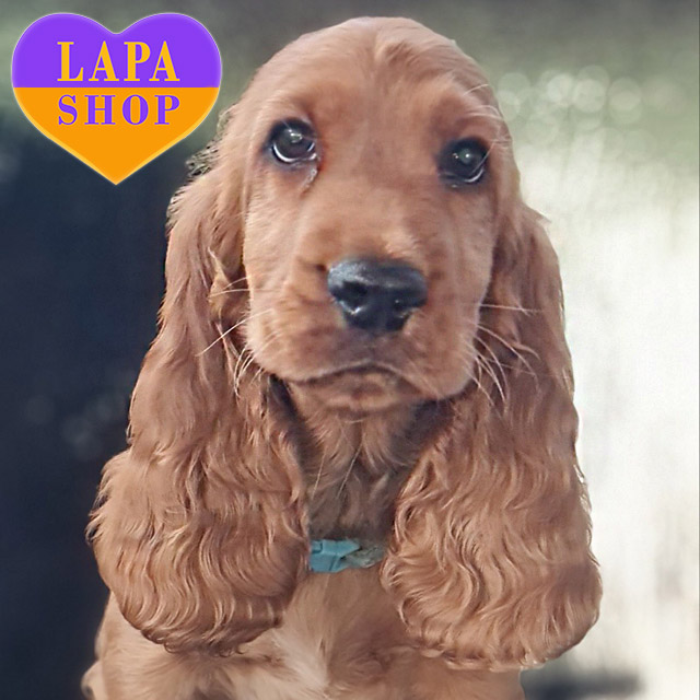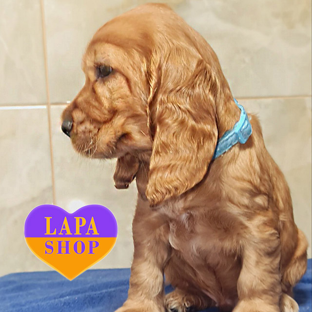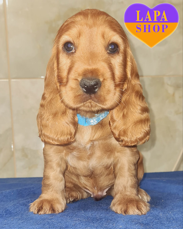 Гарний хлопчик породи англійський кокер-спанієль з глибоким рудим забарвленням та м’якою, блискучою шерстю. Його гармонійна будова тіла та виразні очі надають йому шляхетного вигляду. Малюк має ніжну зовнішність і викликає симпатію з першого погляду.