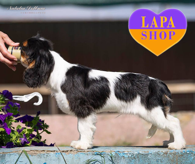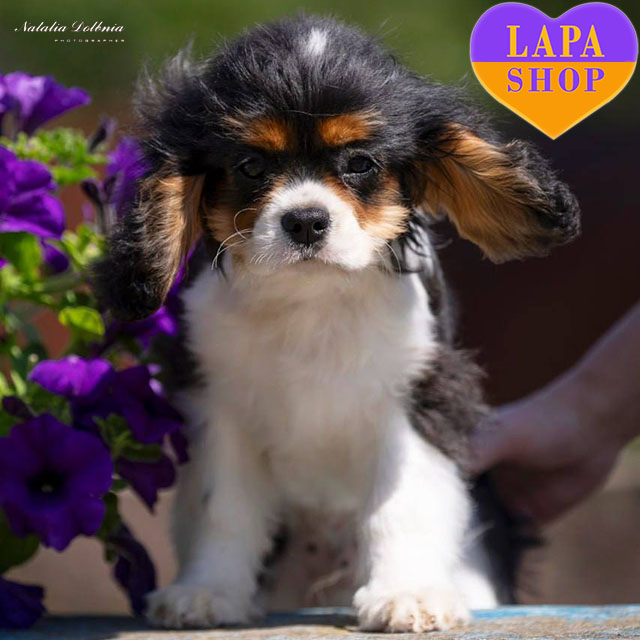 Милий хлопчик породи кавалер кінг чарльз спанієль із виразним триколорним забарвленням. Його симетричні плями, яскраві вушка та граційна мордочка створюють чарівний образ маленького джентльмена. Завдяки компактній статурі й вишуканому вигляду він неодмінно приверне до себе увагу.