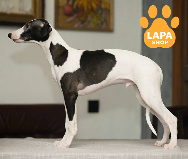 Хлопчик породи уіппет Brizo має гармонійне біло-чорне забарвлення, що підкреслює його витончену статуру та пропорційні форми.