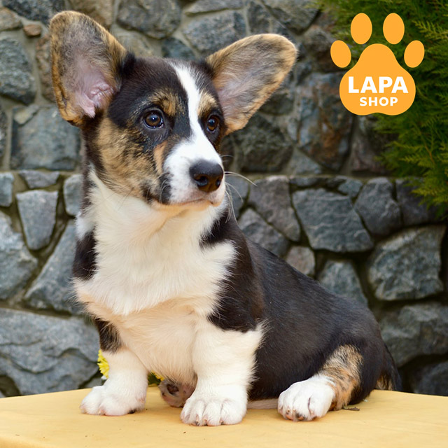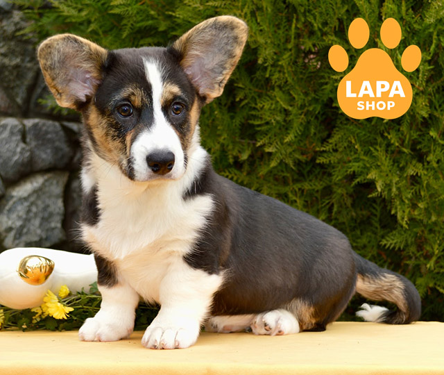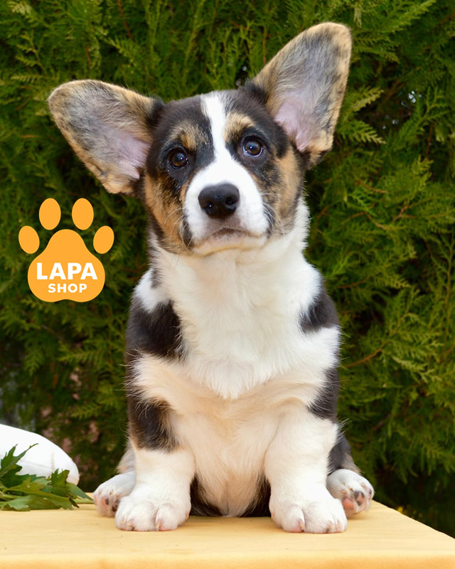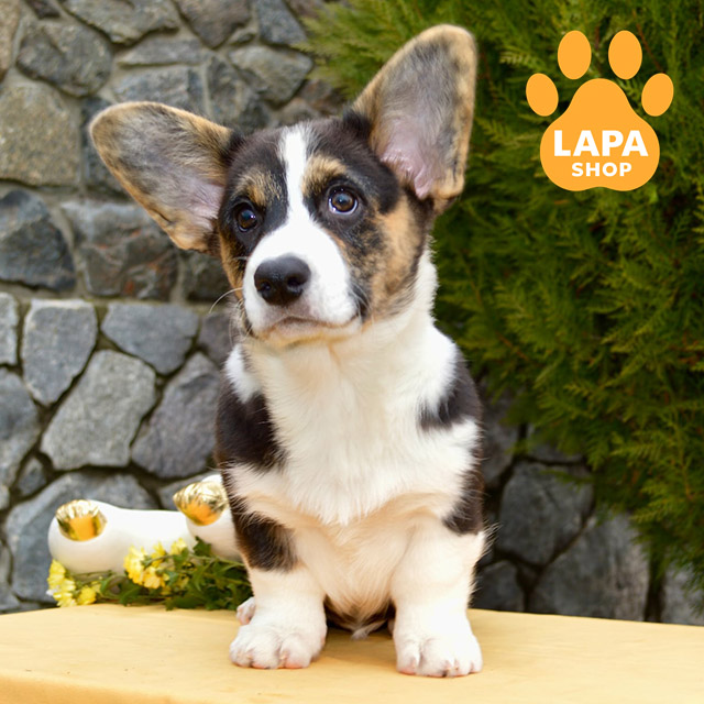 Мила дівчинка породи вельш коргі кардиган із яскравим триколорним забарвленням та виразними тигровими відмітинами. Її компактне тіло й гармонійні пропорції роблять зовнішність особливо привабливою. Контрастне забарвлення підкреслює унікальність та породність, додаючи їй ще більше шарму.