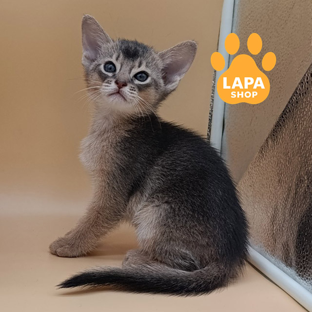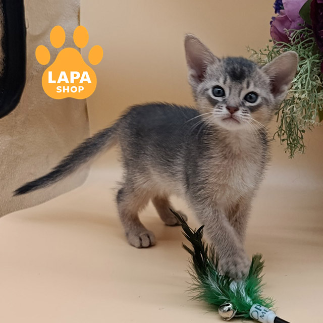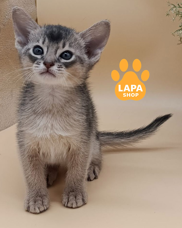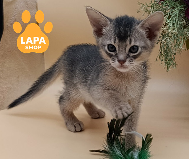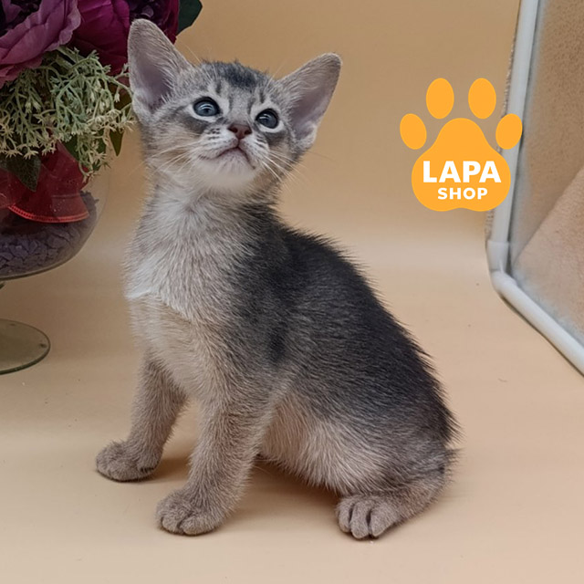 This elegant Abyssinian cat has a luxurious blue color. Its short, silky coat has a delicate silver hue, which adds a special elegance to the look. Harmonious body proportions and an expressive gaze create the impression of a true aristocrat among cats.