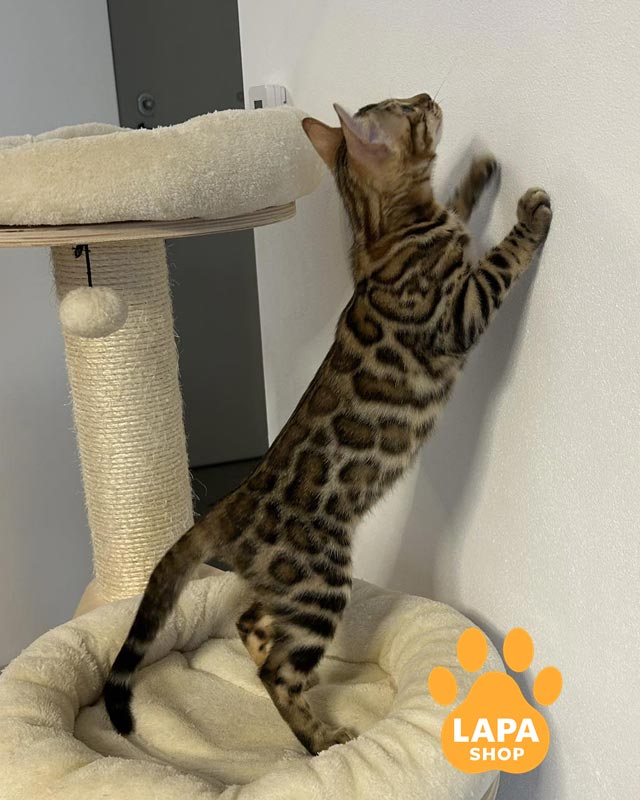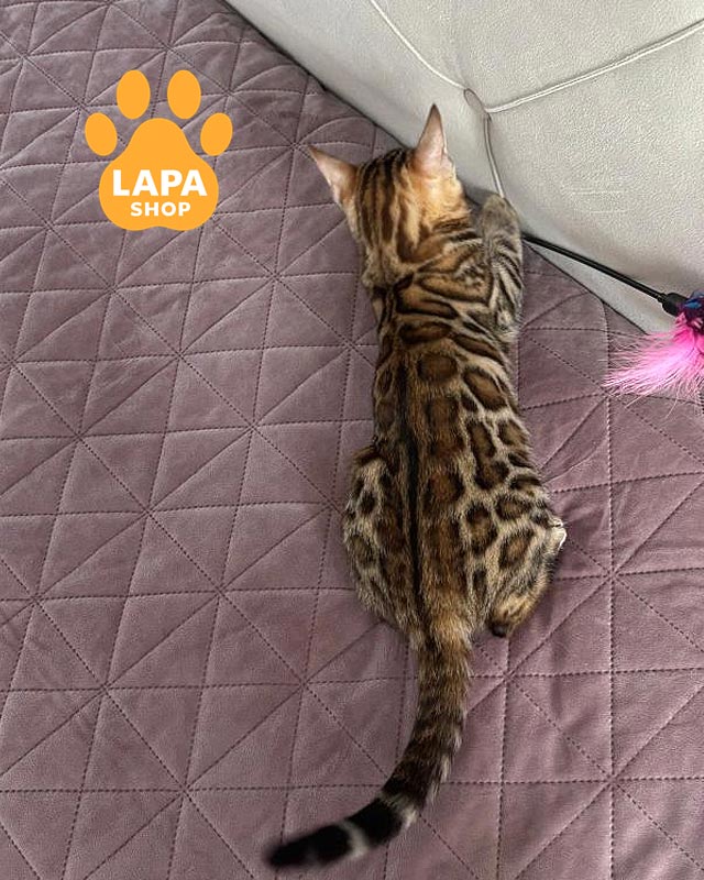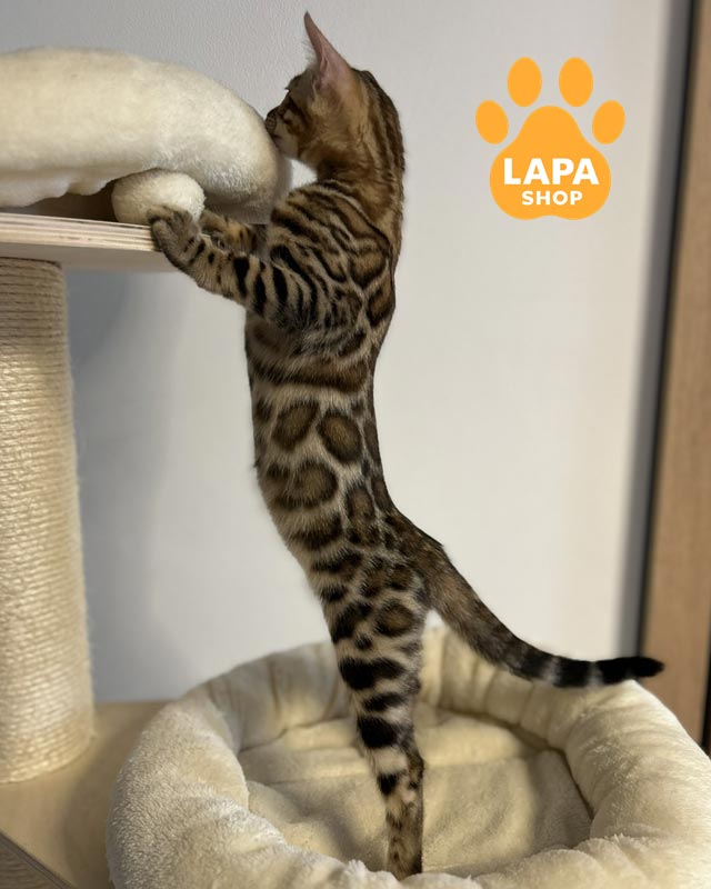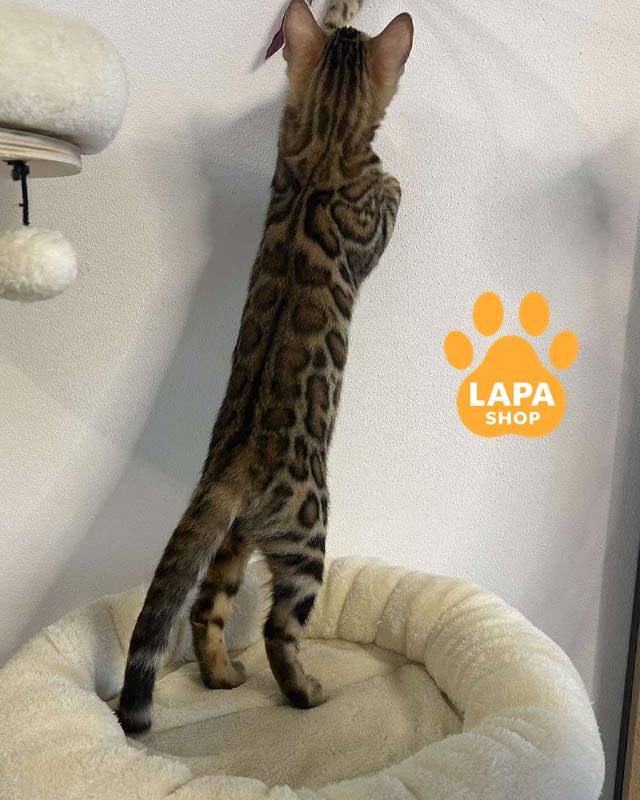 Daisy is a stunning Bengal girl with a rich golden color and rosettes that resemble a wild cat’s pattern.