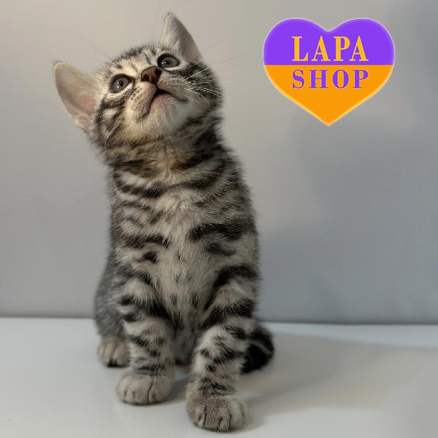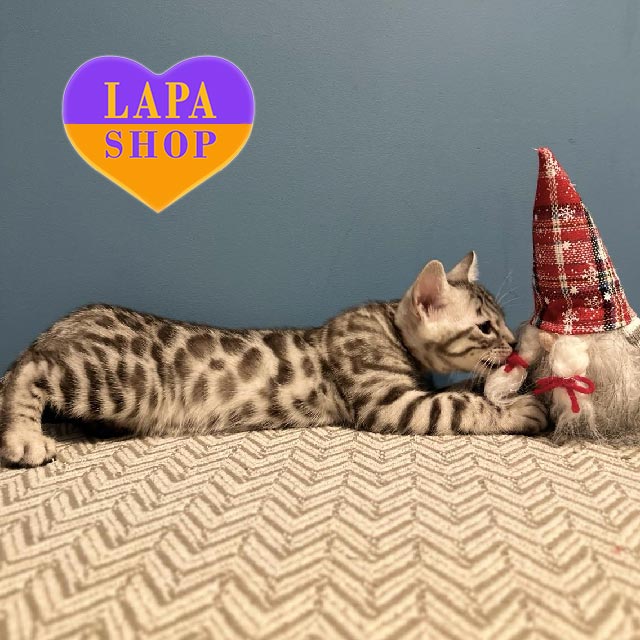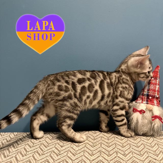Silver spotted Bengal kitten is an energetic and graceful baby. His coat has a beautiful shiny shade of silver, with exquisite dark spots.