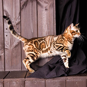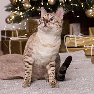 This handsome cat has a sophisticated snow (silk link point (n 33)) color with a slight contrast between the light body and darker markings on the muzzle, legs and tail. His eyes have a light glow, which adds mystery and charm to the image. The soft fur with its characteristic Bengal shine looks especially impressive in daylight.