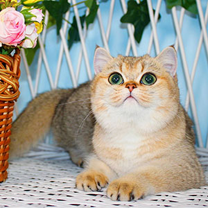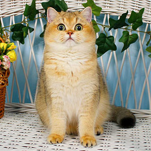 Irvin is an adorable British Shorthair cat with a rare black and gold ticked color. Its thick coat has warm golden highlights that create a sophisticated look. Harmonious features and an expressive face add to his special appeal.