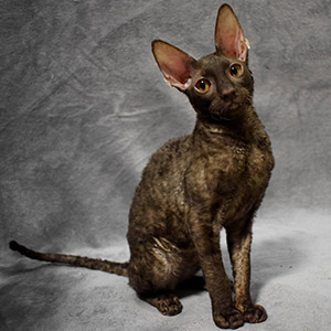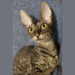 Iriska is a graceful Cornish Rex with a distinctive black tabby color and wavy, silky fur. Her elegant profile, large ears, and graceful figure emphasize the elegance of this breed.