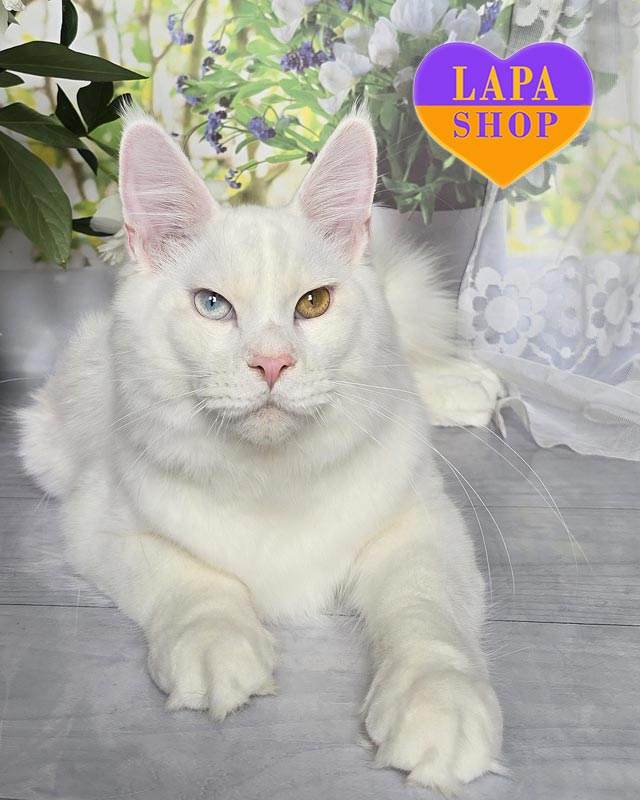 Pheromone is a snow-white Maine Coon with different eyes – one is the color of the icy sky, the other is a shade of amber.