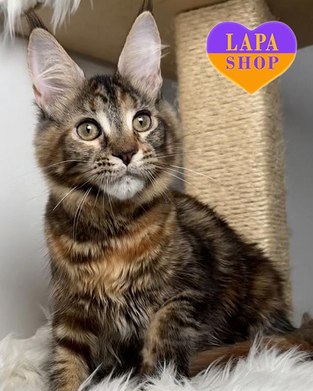 Gretta is a graceful beauty of the Maine Coon breed. Her luxurious coat is decorated with a spectacular tortoiseshell marble pattern, and her gaze is full of intelligence and curiosity.