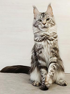 Its thick silky fur sparkles with delicate silver, decorated with an exquisite marble pattern, emphasizing the strength and nobility of this breed.