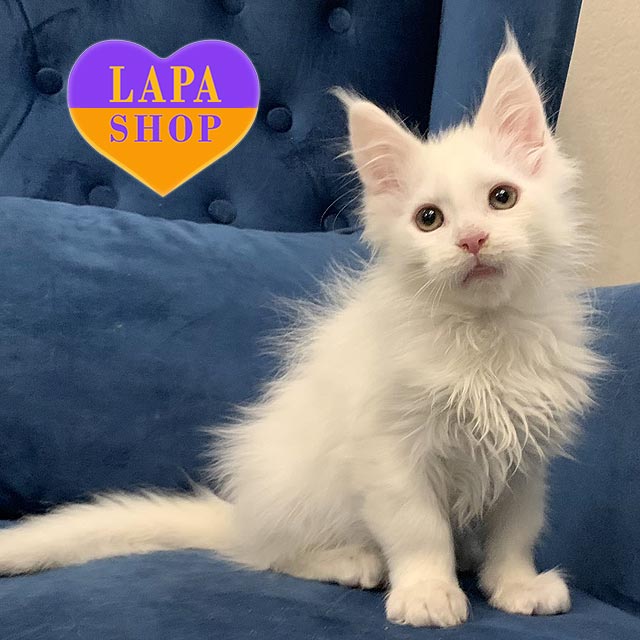 Fargo is a snow-white Maine Coon with mysterious yellow eyes.