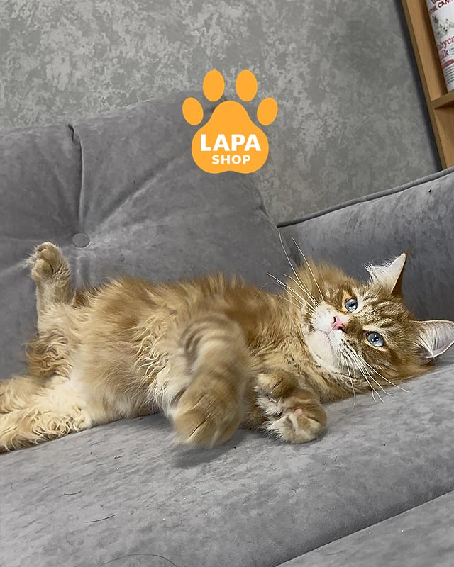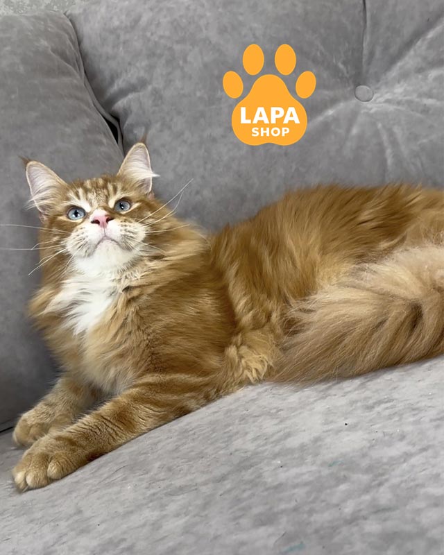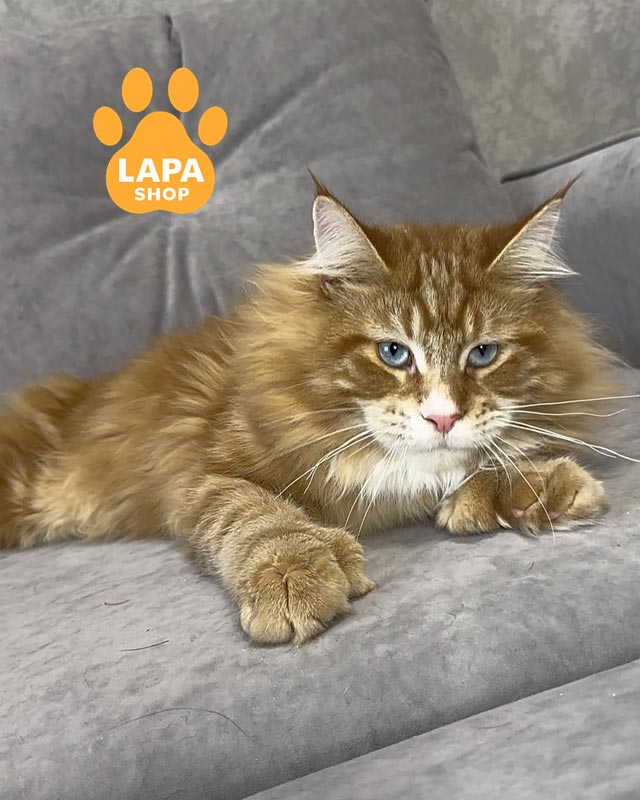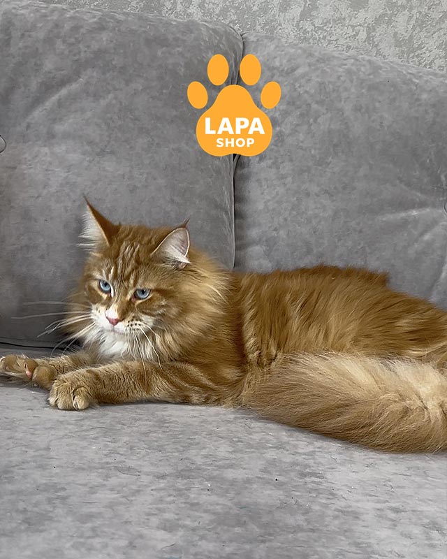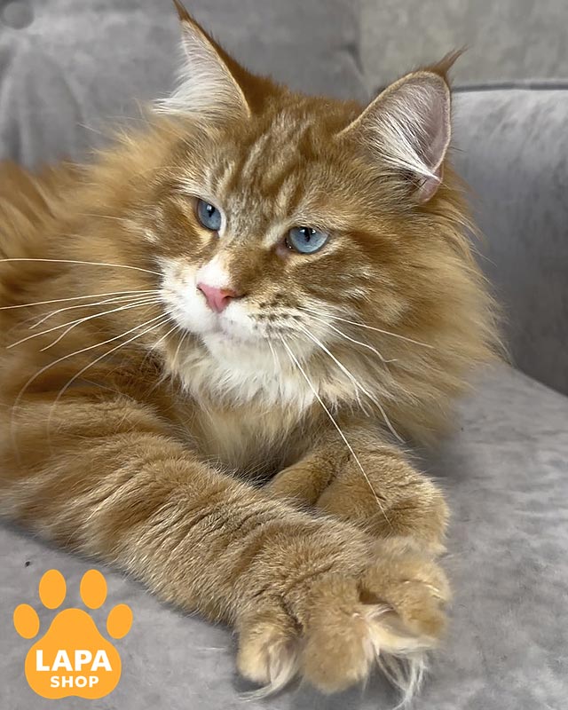Matvey is a red-silver Maine Coon polydactyl F3 with blue eyes. His large paws and graceful posture are harmoniously combined with a good character and lively temperament. He will grow up to be a true loyal friend and a handsome giant.