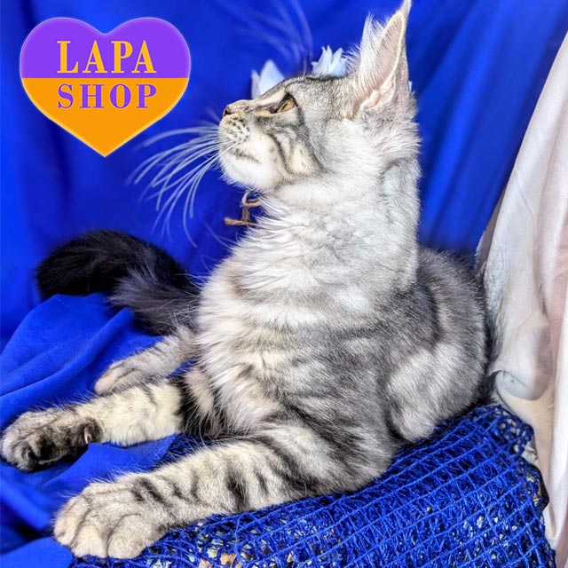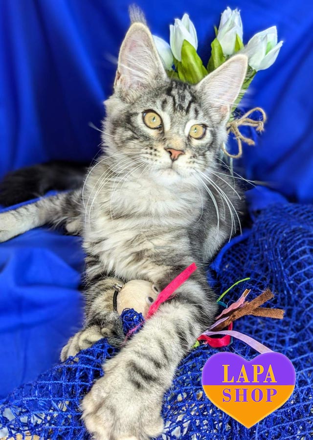 Muffin is a small handsome Maine Coon. This graceful Maine Coon captivates with his black marbled pattern on a silver background and expressive eyes. Affectionate, playful, inquisitive and very active, he is always on the move and interested in everything around him.