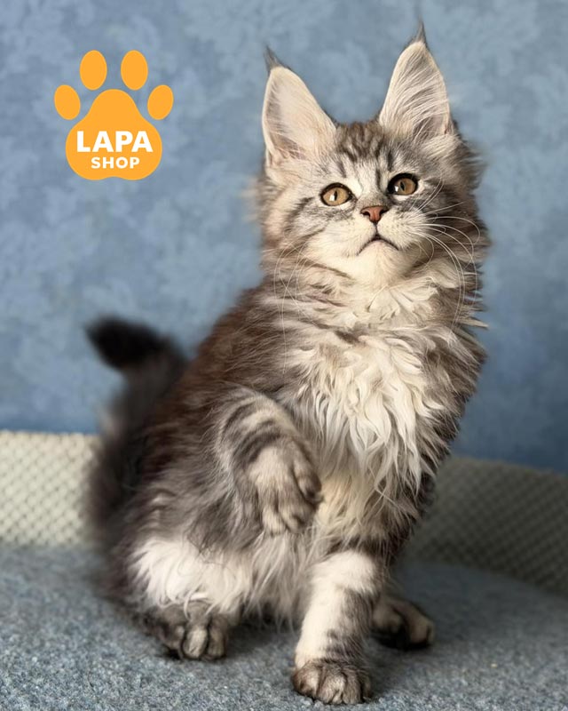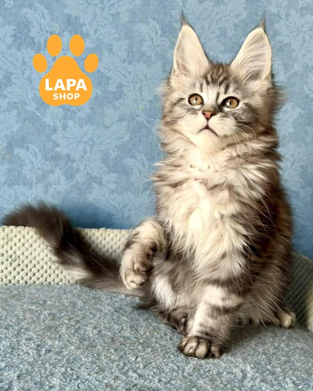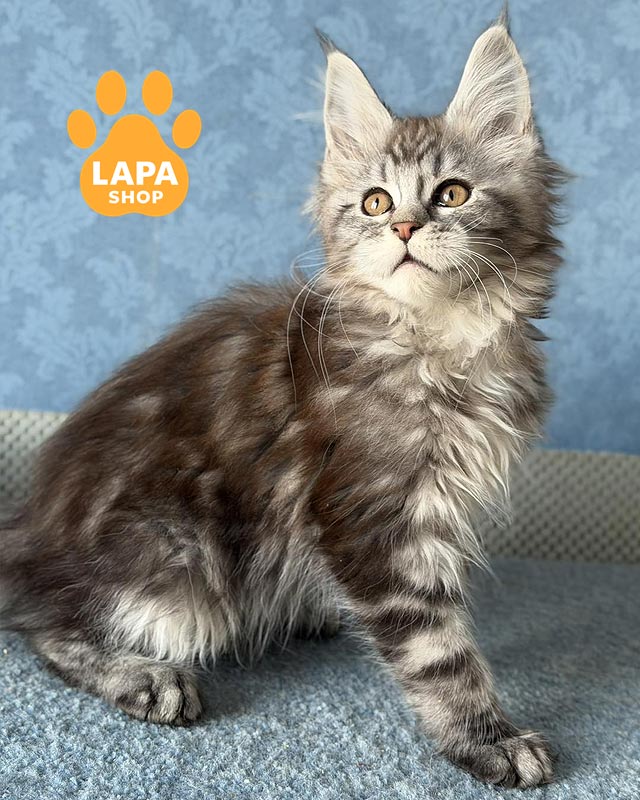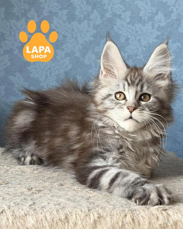 Lisa is a Maine Coon girl with a spectacular silver marble color (ns 22), where a clear contrasting pattern beautifully appears on a light silver background.