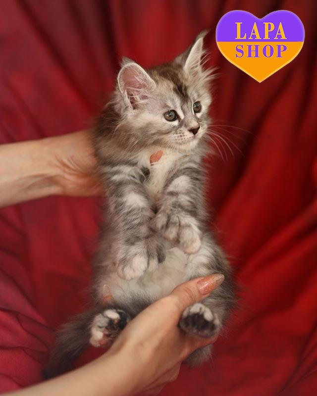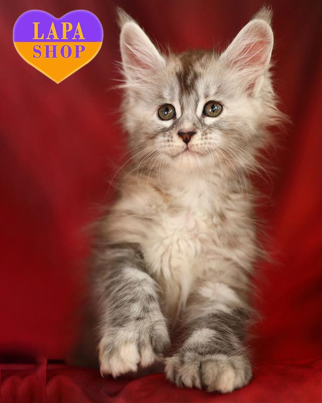 Nyusha is a special Maine Coon polydactyl girl with an exquisite tortoiseshell silver ticked color and cute extra toes.