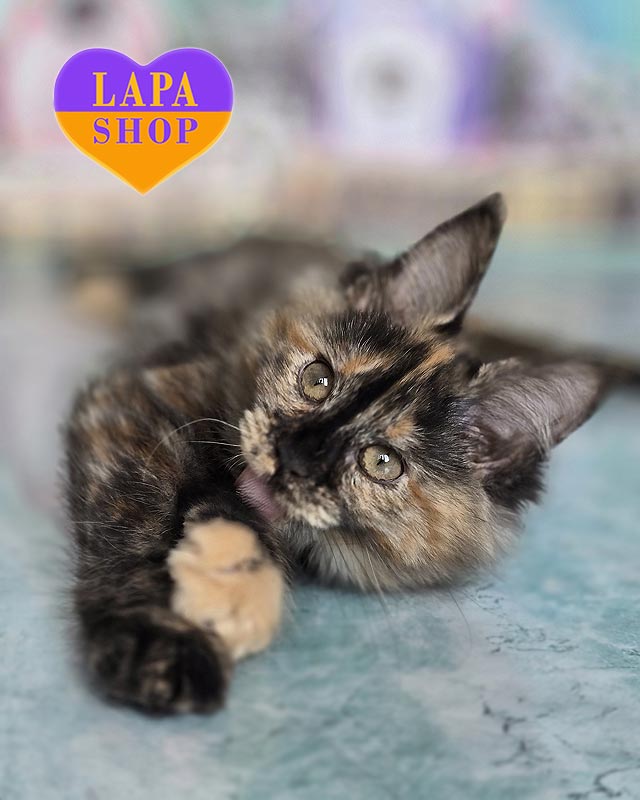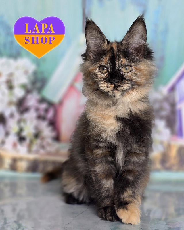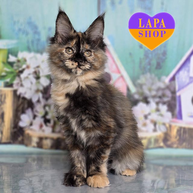 A Maine Coon kitty named Vatrushka is a real cloud of comfort with a tortoiseshell color, where the shades of autumn are intertwined.