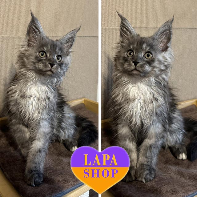 Nikolas is a graceful Maine Coon boy with a noble black smoke color and white markings.