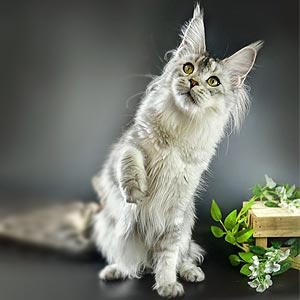 Maine Coon Richard is an impressive boy with a powerful build and silver marble color (ns 22). His fluffy coat and penetrating gaze captivate from the first meeting.