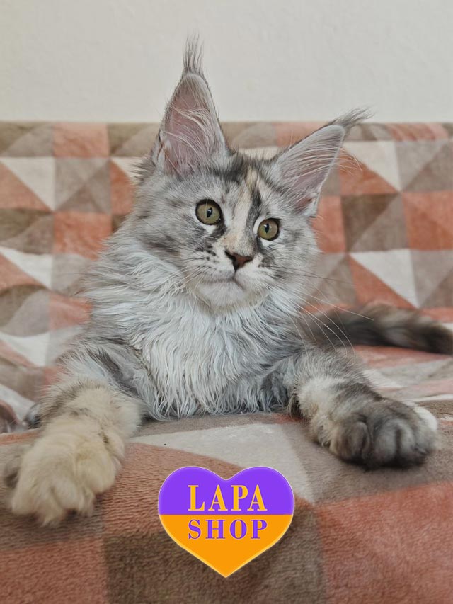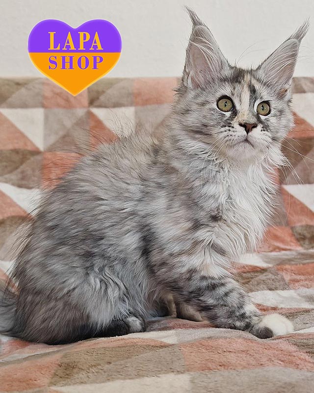 WowBaby is an incredible beauty of the Maine Coon breed with luxurious tortoiseshell silver color (fs), which looks like a shimmering starry sky. Her name fully reflects the impression of the first meeting.