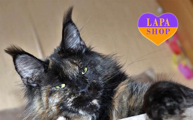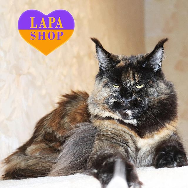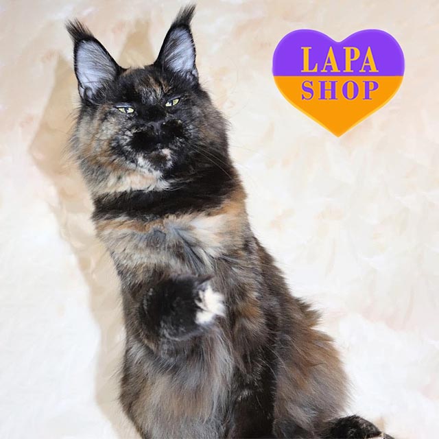 The impressive girl Yamaha is a representative of the Maine Coon breed with a bright tortoiseshell color that emphasizes her character and grace. She has a strong physique, fluffy coat and majestic features typical of true representatives of the breed.